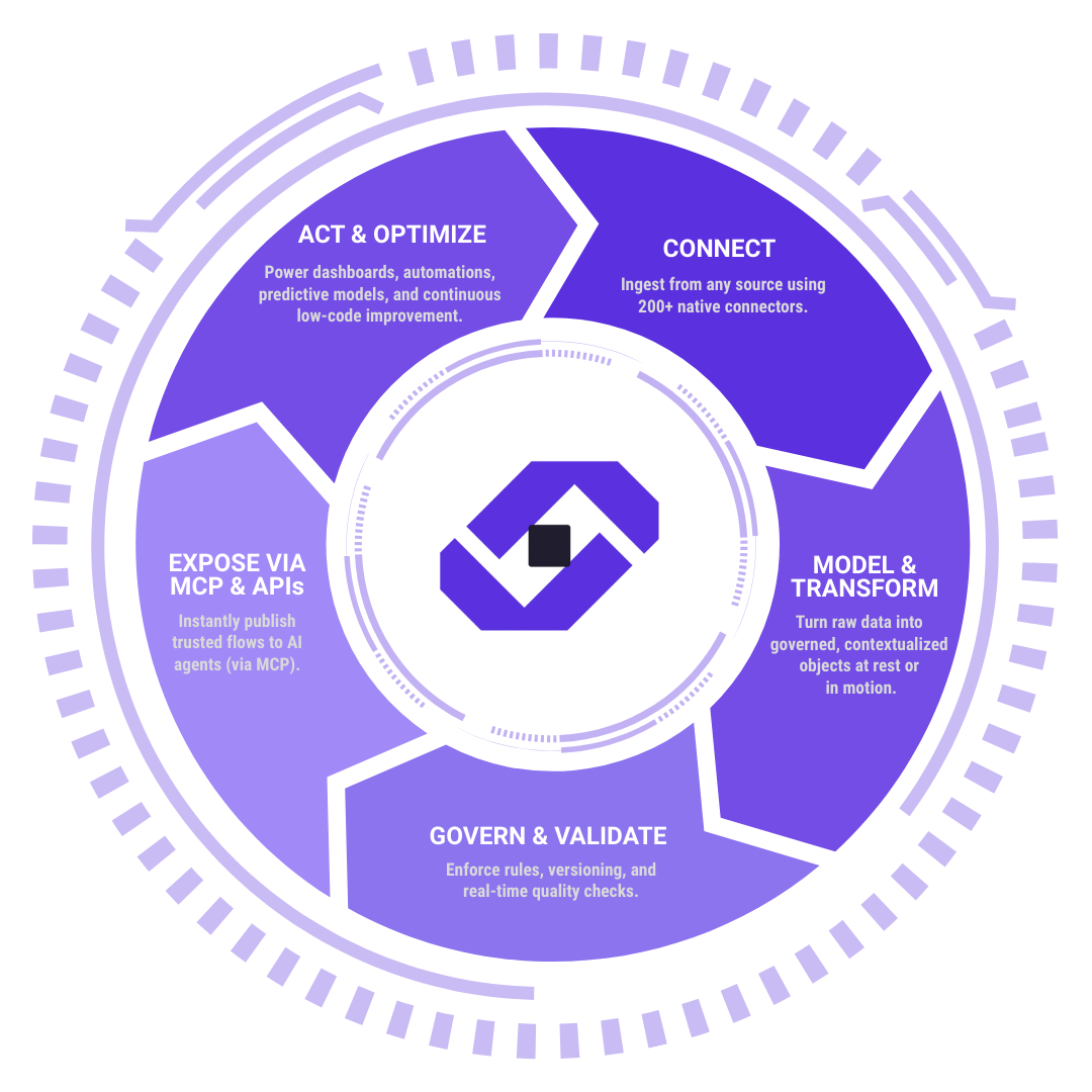 MCP-Native AI Exposure — Governed data flows are instantly queryable by LLMs and AI agents via the Model Context Protocol—no custom middleware required.